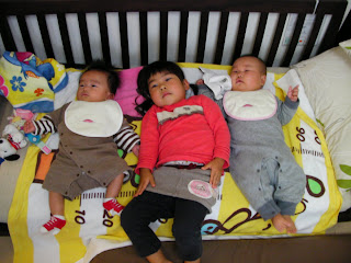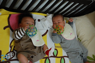 こずが2人にお揃いのイルカのスタイをおみやげにくれたので、一緒につけてお揃いのおもちゃで遊ばせてみました♪