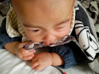 色々な物で気を惹きながら遊んでみるけど、なぜだか一番食いつきが良いのはママの眼鏡です。