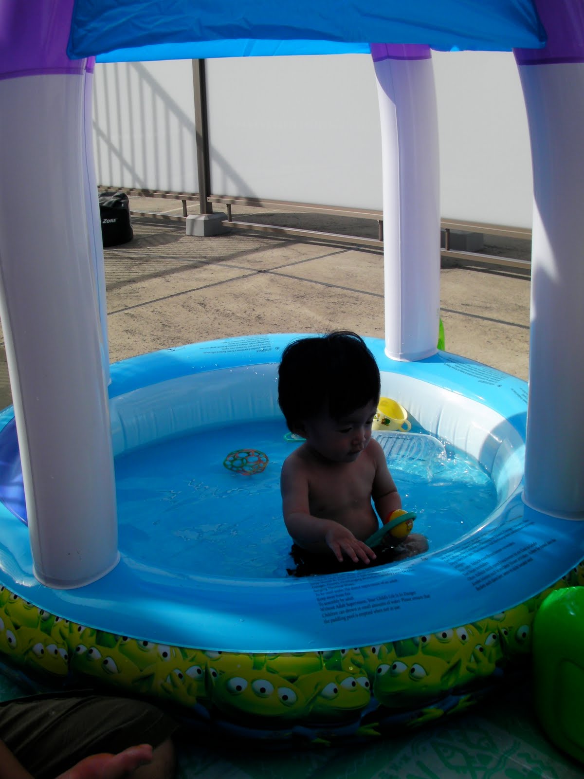 トイストーリーのプールで日よけ&水鉄砲のオモチャ付きのものすごくいい感じのプールでした☆
