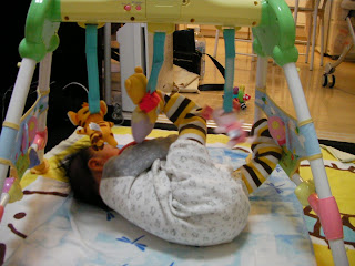 まだ右へ寝返りできない弱点をついて、右端で遊ばせるしかないね。