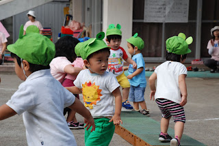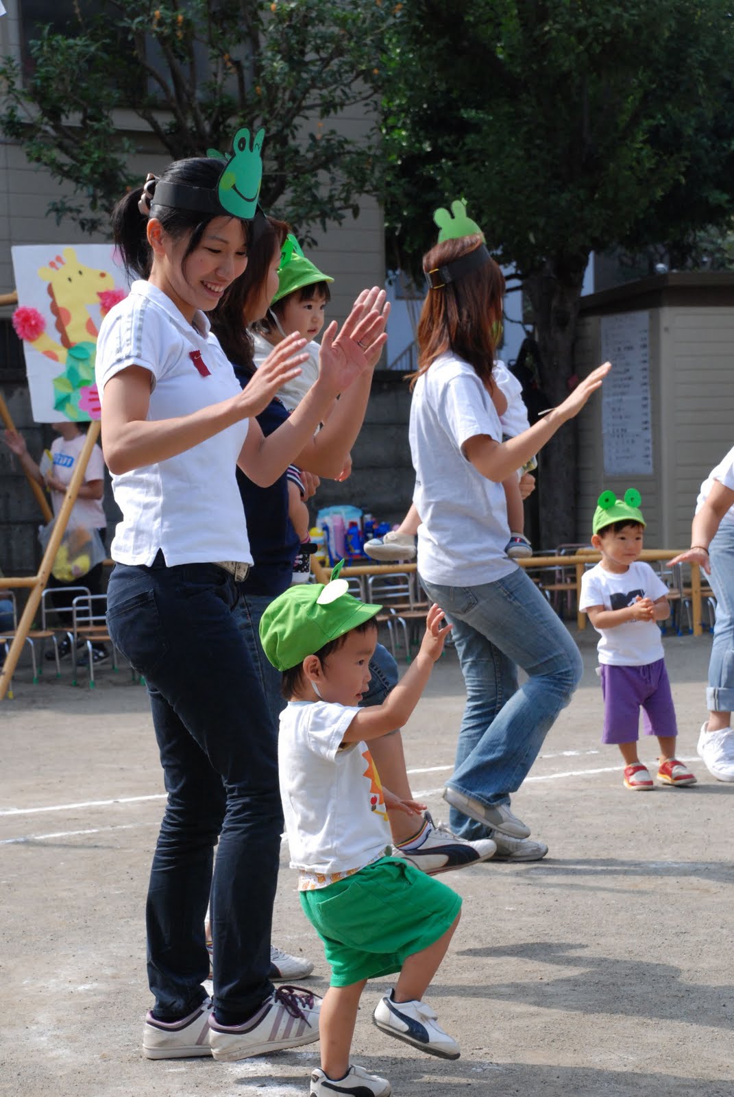 今年は「10ぴきのかえる」の絵本にちなんだストーリーで、カエルの格好をしたすずめ組の子供達が冒険をしながらザリガニの格好をした先生に出会って逃げ回り、最後は仲直りしてみんなで踊るというものでした。