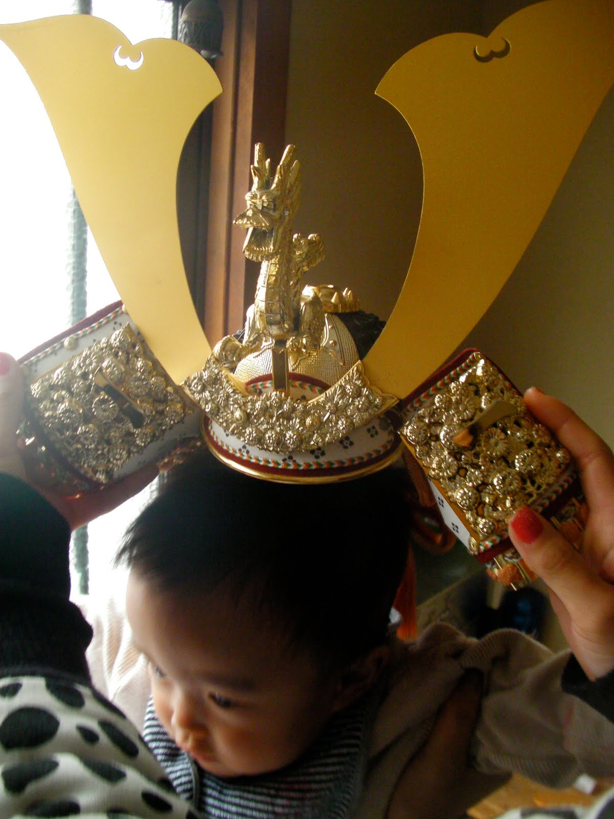 玄関にはパパの立派な兜が飾ってあったのでこうちゃんちょっと試着(笑)