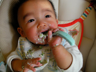 基本の行為はママからスプーンを奪い取って口へ運んだ後は「もっとくれー」と言わんばかりにスプーンを振り回す。